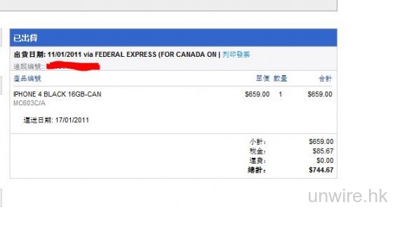 昨天報導一則 iPhone4 購入加拿大電話的新聞,有些讀者回報指訂單沒有合併所以購買失敗,筆者考慮到有失敗個案所以把方法抽走。可是筆者昨晚也是依照同樣方法成功把加拿大的 iPhone4 寄出,以下是筆者訂單的抓圖,因此未知是否 Apple 把系統稍作改動令某些讀者失敗。其實昨天想把圖做完抓圖後立即 Cancel Order,怎料 order 立即生效筆者沒有機會去取消,信用咭亦過了帳。現正考慮用 Skype 打去加拿大客服取消 Order (P.S SKype 打 Apple 客服是免費的) ,筆者曾詢問過加拿大那邊客服,如果 iPhone4 沒有人收到,當退回 Apple 後會自動進行退款手續,(筆者就是為了保障,所以才要求鍵入加拿大的地址必需是假)但勸各位購買失敗而又過了數的讀者,最好用 Skype /IDD 打去加拿大客服做 Cancel Order,這樣幾分鐘裡就可以進行 Refund ,3-5 工作天內就會全數收回。